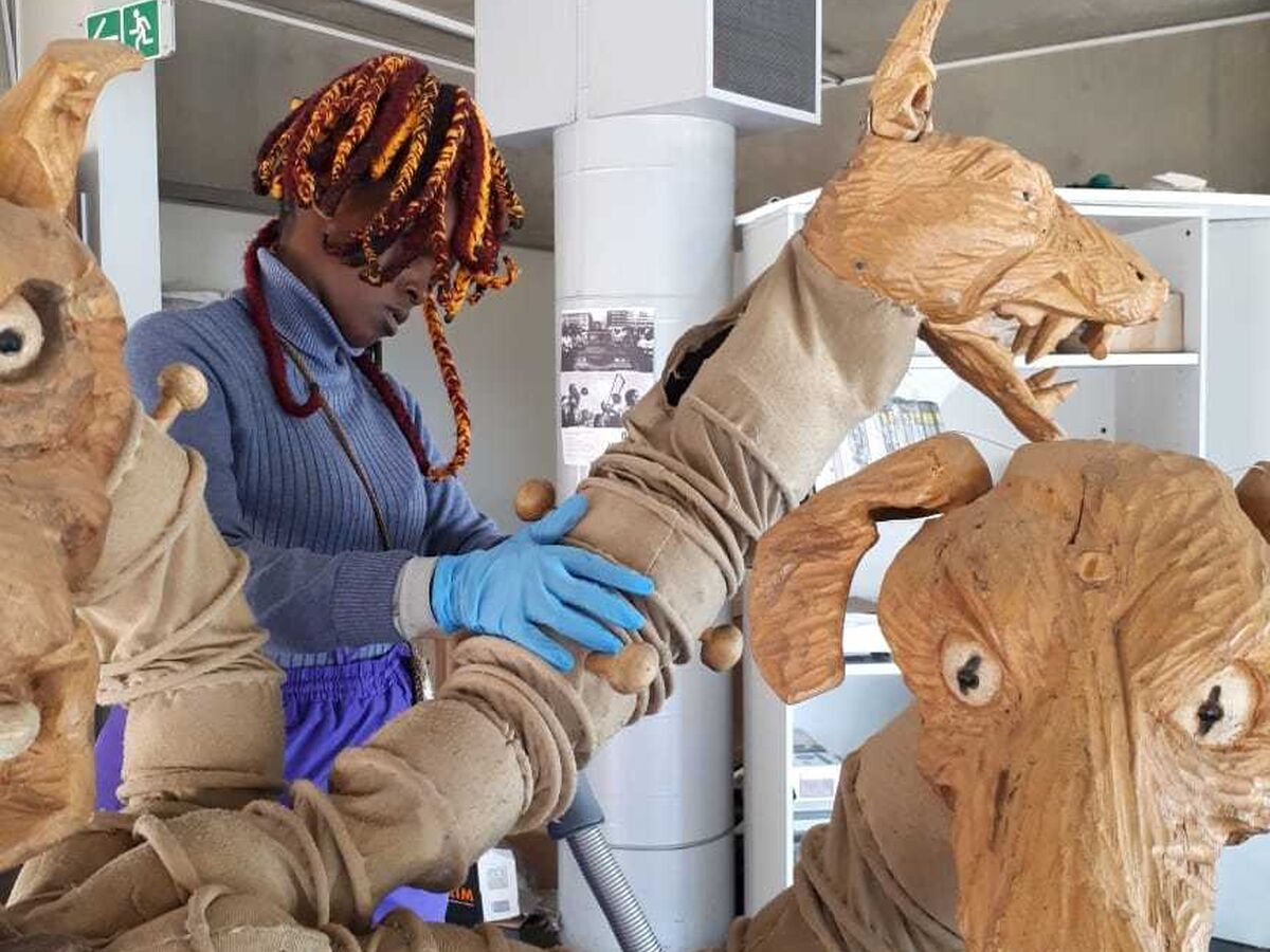 Handspring Puppet Company, Dogs of War, 1997. Constitutional Court Art Collection. Photograph by Malwande Mthethwa © Constitutional Court Trust. In June 2019, the curatorial team vacuumed the dogs' necks over two days using nylon fabric to protect it from damage. The wooden parts were coated three times with Dubbin. The team waited a day between each layer to allow it to dry. The sculpture was returned to the public gallery in July 2019.