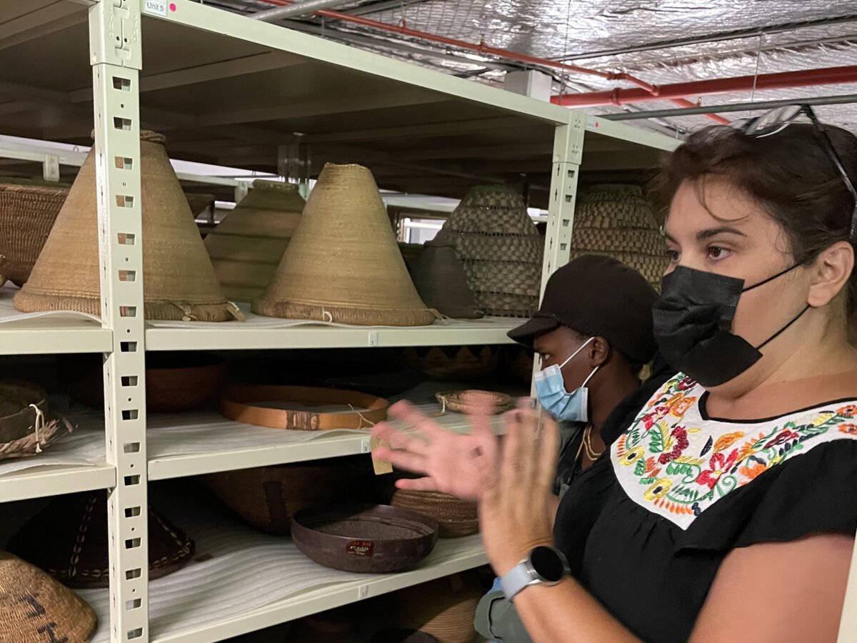Later that morning, Philippa van Straaten, the registrar at JAG, took us through one of their artwork storage rooms to look at their collection of smaller baskets and one large basket currently on display in the gallery. Angeline assessed the basket on display (pictured above) and determined the possible conservation that it may require.