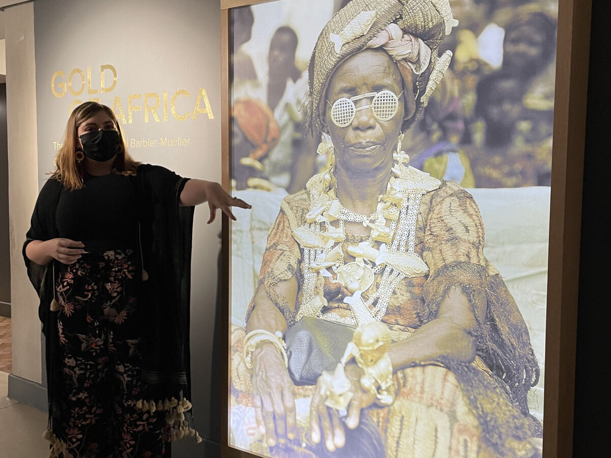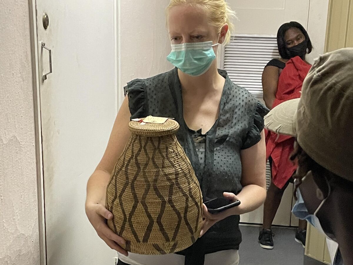 Master weaver Angeline Masuku photographed next to her basket featured in the Wits Art Museum's Seen, Heard and Valued: 40 Years of the Standard Bank Art Collection exhibition. Photographed by Francois Lion-Cachet.