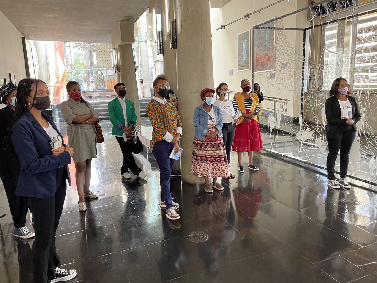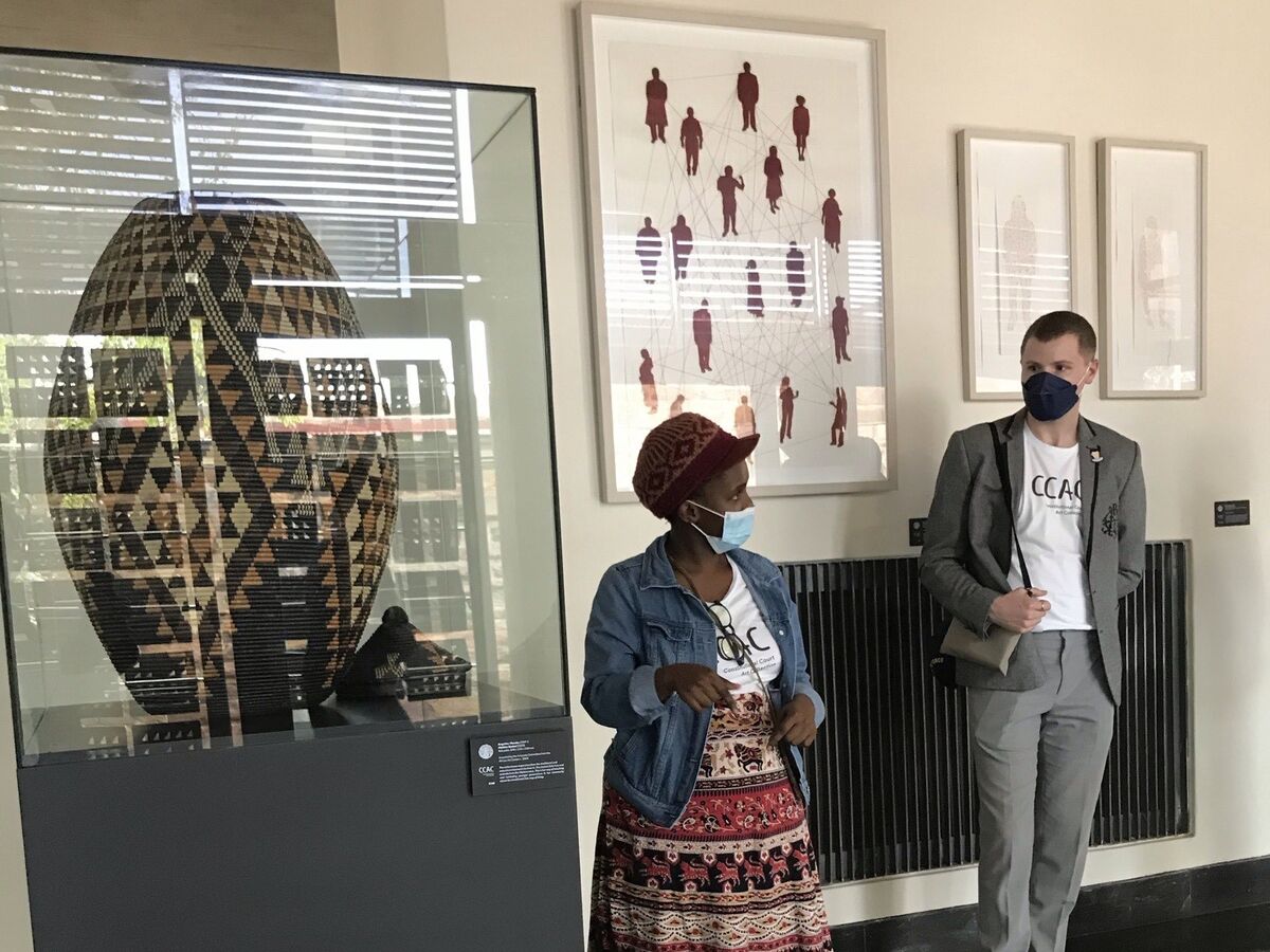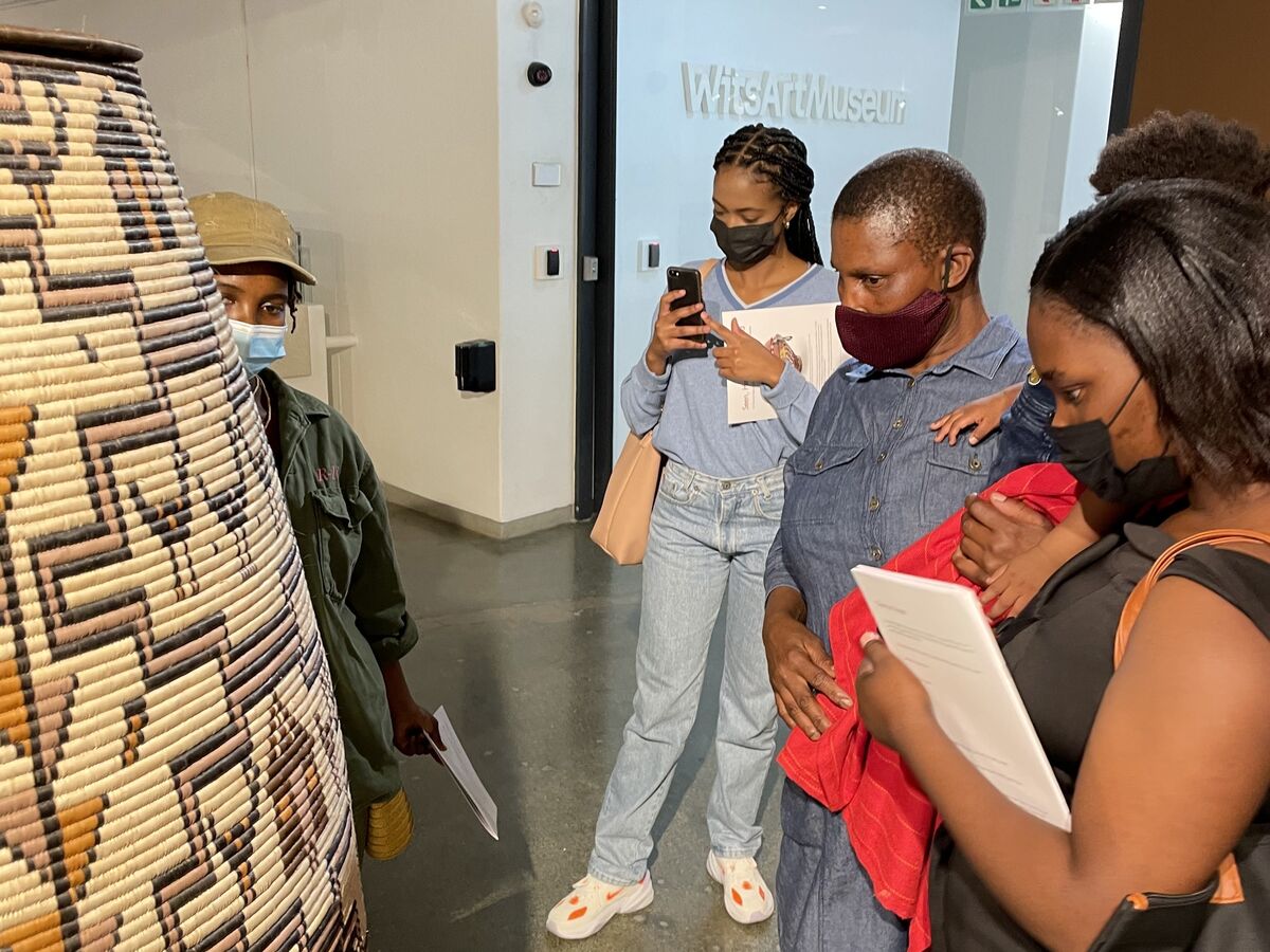 On 17 February 2022, master weaver Angeline Masuku and her daughter Nokukhanya Khumalo joined the curatorial team for a three-day long engagement, touring museums and galleries in Pretoria and Johannesburg namely the Ditsong National Museum of Cultural History, Javett-UP Art Centre, Wits Art Museum and Johannesburg Art Gallery. The tours focused on Zulu basketry in museum collections and served to motivate the exchange of expertise and insight on the care and conservation of these baskets. The curatorial team facilitated the introduction of Angeline and Nokukanya, who is also a weaver, to Gauteng-based curators at these institutions who care for such basketry and other grass-based objects. Following the tours, the curatorial team hosted the curators and colleagues from Constitution Hill and the Gay and Lesbian Archive for an intimate lunch at the Constitutional Court followed by a walkabout of the CCAC and a vote of thanks by Angeline Masuku.