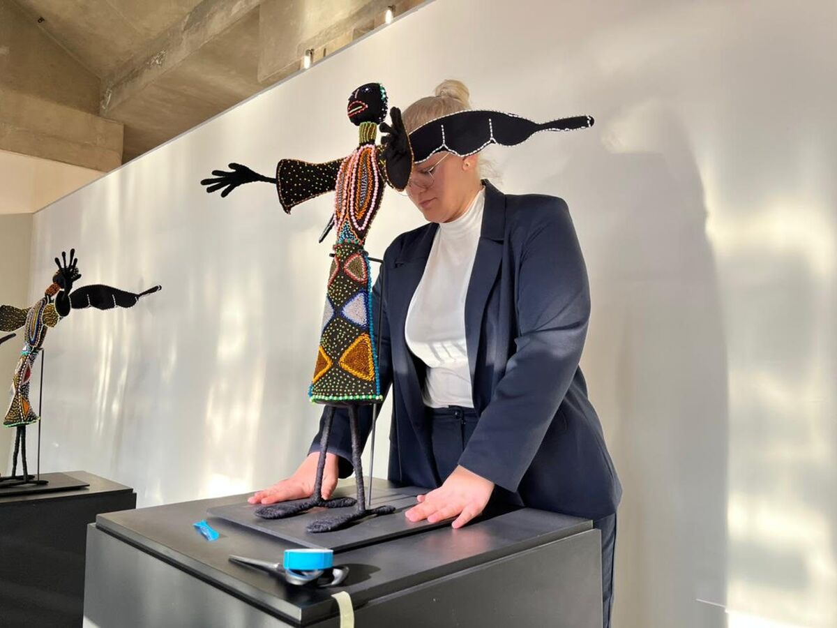 Micayla Mohamadie working on the in-house conservation of Thafa Dlamini and Ceaser Mkhize's Beaded Angels.